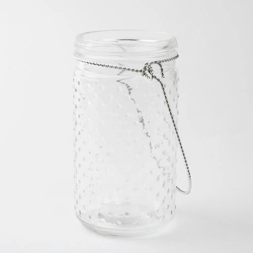 This simple and elegant glass holder features a sturdy silver braided handle that allows for easy hanging in your desired location. The dainty raised dots will add depth and dimension to whatever is placed inside. This textured, clear glass holder can be filled will candlelight; but is also a beautiful vessel for small bouquets of fresh flowers. This glass jar looks beautiful on a Shepherd Hook or placed on a table for a centerpiece vase. Perfect for the Home, Entertaining, Weddings, or Events!