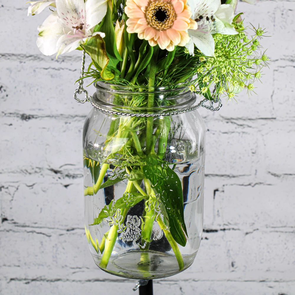 This lovely decorative glass mason jar with a braided silver metal wire handle and raised designs can be placed around your home or event space as a floral vase, or used as a hanging holder. This quality, thick glass jar will beautifully display fresh flowers and greenery. The raised textured design on the large jar gives just the right amount on vintage flair to the piece. This set of 12 jars is sure to be a hit for weddings, outdoor entertaining, and home décor!