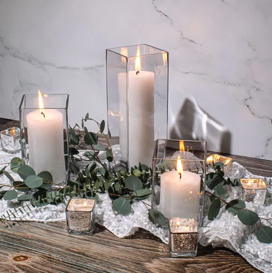 This ready-to-use graduated set of Square Vases is perfect for weddings, restaurants, churches, or in the home! With three sizes that add dimension to your table, this set is simply perfect in any setting. With their sturdy composition and thick bottom shams, these heavy-duty vases stand firm and proud in their environment. The beautiful, dramatic effect of crystal clear glass, modern angles, and your addition of fresh flowers, candles, or vase fillers makes this versatile six centerpiece set a winner!