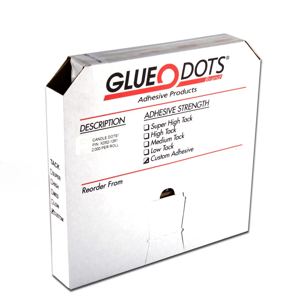 The ultimate solution to keeping your wicks perfectly centered in your jars without having to use those messy, dangerous hot glue guns or expensive super-glue. Highly adhesive GLUE DOTS™ come on a roll inside a handy dispensing box. You simply press the tab of your pretabbed wick onto the wick sticker to remove it from the roll (which is wax paper, so it is removed very easily). Then, simply press firmly down into the center of your jar and you’re DONE! Another accessory that works well with these GLUE DOTS™ is our Bow Tie Wick Bars.