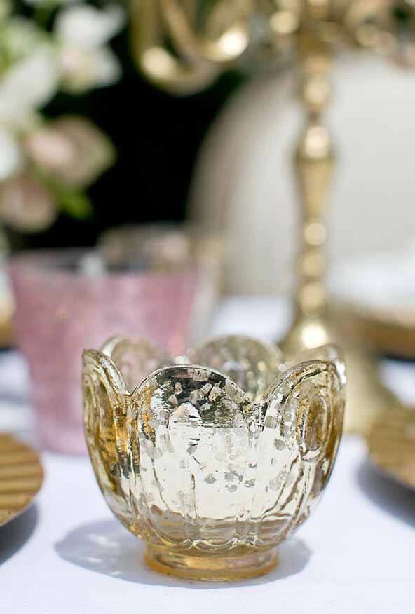 Bring an exotic ambiance to any setting with these Gold Carraway Votive Holders. With their reflective gold dappled exterior, silver interior, and translucence, this luxurious mercury glass candle holder gives off a delightful glow when filled with a lit candle. Use this holder to accent your special event décor, or embellish a dark wood coffee table or desk in your home.
