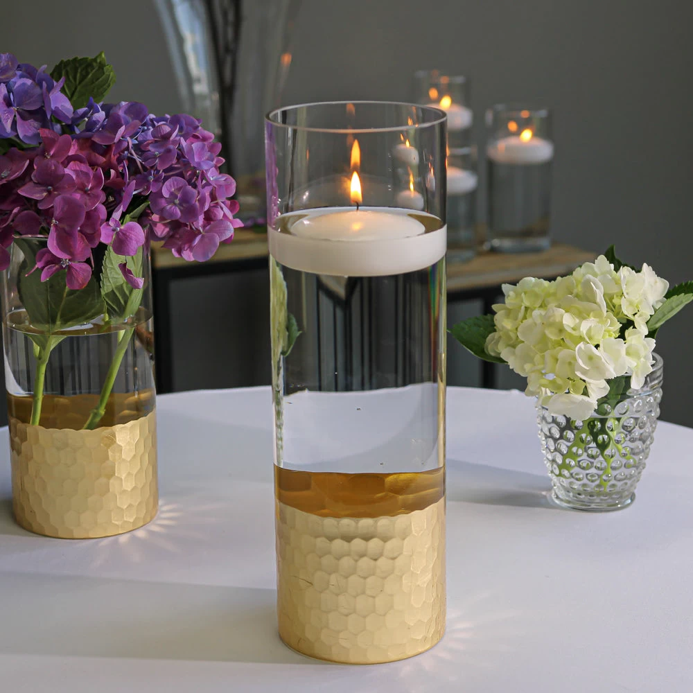 You will love this gorgeous Gold Honeycomb Cylinder Vase 12″. This versatile piece is perfect for flower arrangements or for use as a pillar or floating candle holder! This clear glass cylinder vase has contemporary styling with a dimpled honeycomb pattern around the base. This glamorous gold-dipped vase is great choice for weddings and special events; or as a lovely accent piece in your upscale home!