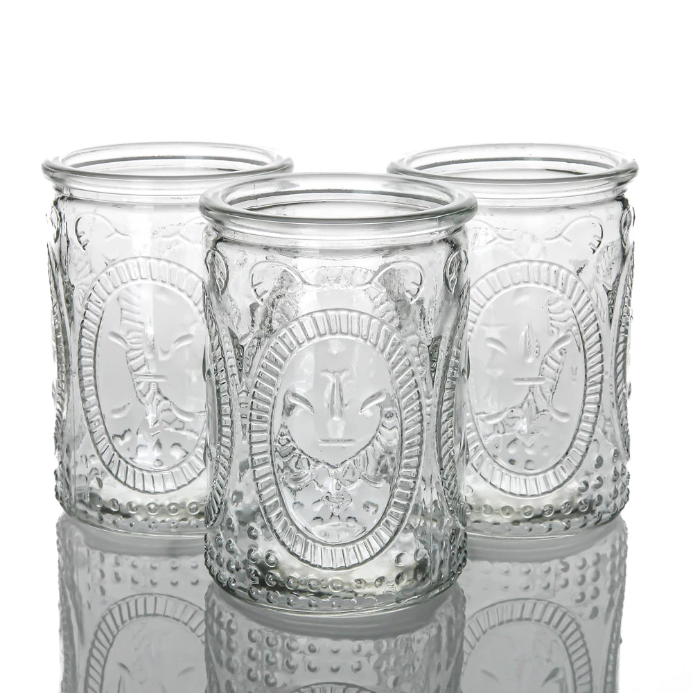 Tantalizing Texture! This thick clear glass holder is vintage-inspired and instantly upgrades any setting. As this piece is cleverly sized to serve as both a candle holder and a small vase, the possibilities are endless with this nostalgic-feel gem. The holder features an intricate raised texture design; and when a candle is placed inside, the light dances through at different angles to create a lovely ambiance. An excellent choice for weddings, events, dinner parties, gifts, and more!