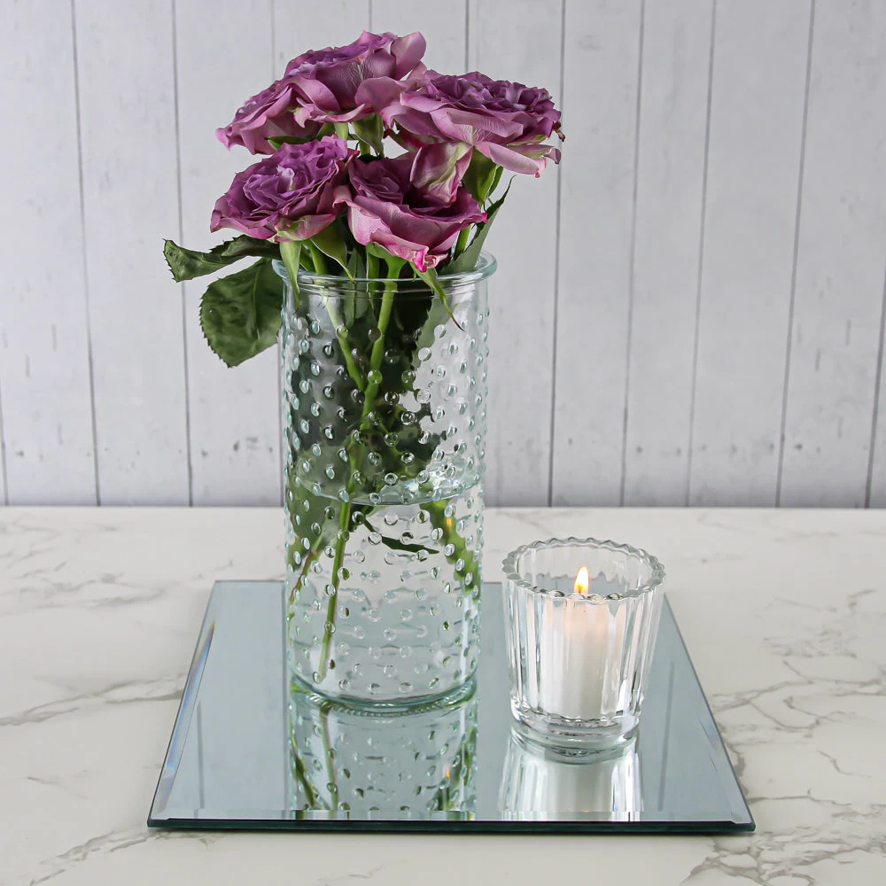 This dotted glass vase makes for a beautiful home for flowers or candles! The textured hobnail exterior makes this piece perfect for farmhouse décor and whimsical settings. Take any tablescape from simplistic to classy by adding your favorite blooms to this charming, vintage-inspired vase. With candlelight inside, the effect through the glass is stunning. A great option for weddings, events, and home décor!