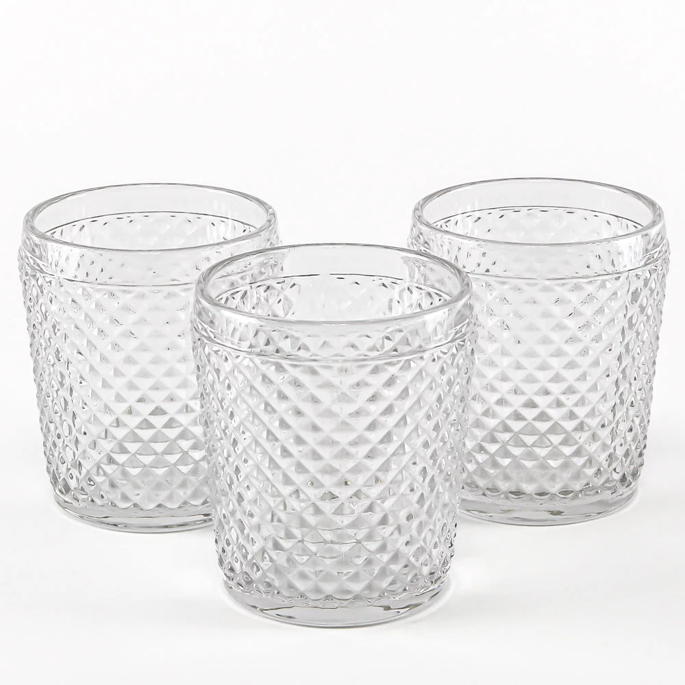 Brilliant! The effect and glow of candlelight through this patterned holder is truly stunning. The textured diamond detail in the thick clear glass creates a different ambience from angle to angle that everyone will love. Great for special events, restaurants, and in the home! With its great size and stylish look, this holder can also be incorporated into displays as a mini vase with fresh flowers or sprigs of greenery.Â