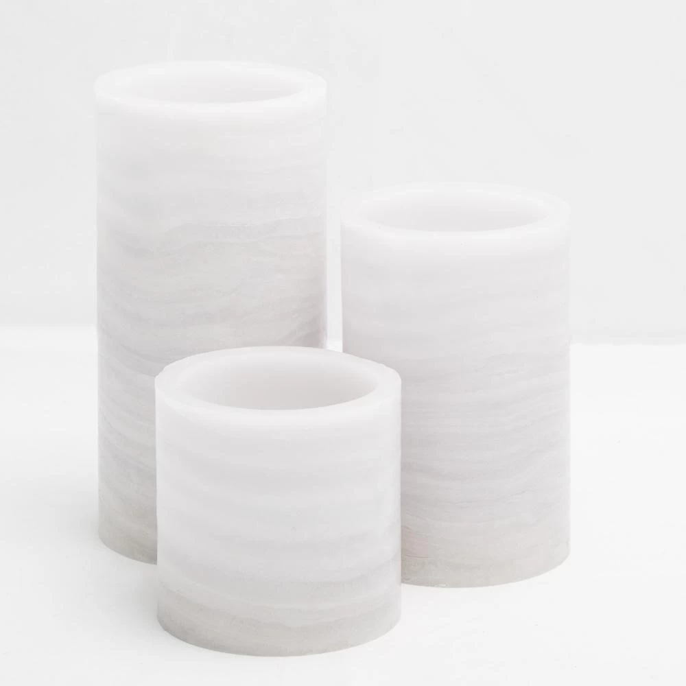 These fabulous candles provide hours upon hours of hassle free simulated candle glow! With an outer wax shell and flickering LED flame, this candle is perfect for home or event! The grey marbled wax shell is the perfect modern touch to any décor. Offered in a small, medium and large, these candles look great on their own or mix and match sizes to create an instant centerpiece! This candle is a great option for no-flame venues.