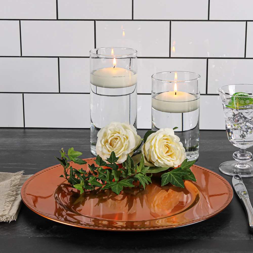 Richland Floating Candles are the perfect floating candle! The highest quality solid color wax, 100% cotton wick, unscented, and clean-burning combine to make this candle a winner! This set of 12 total candles features a sophisticated smooth finish and simple beauty to add elegant ambiance to your home or special event. With their extended burn time, these candles are a cost-effective and perfect option for longer events like weddings, receptions, parties, church services, charity events, restaurants, or even just a night at home. These floating candles can even be placed in pools and fountains to create a beautiful glow for an evening event. Pair these floating candles with our huge assortment of Eastland Floating Candle Holders (not included).