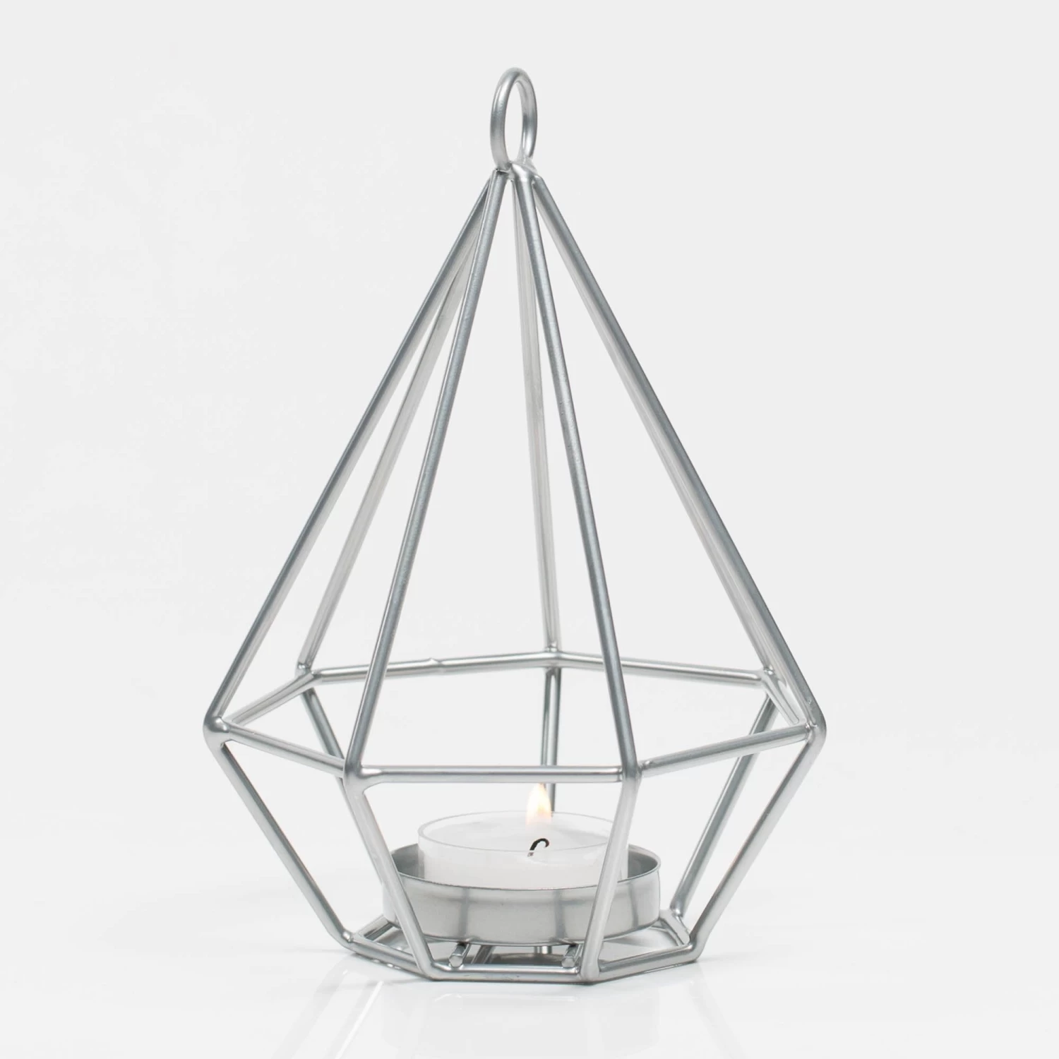 Our geometric tealight candle holders are edgy and fabulous! The simple open design allows for the candle light to glow from within – accentuating the cool metal shape! With the top loop, these not only can be stand-alone pieces of intrigue in table design; but you can also hang these holders from one of our shepherd hooks to enhance any entry way or path. A great option for a modern wedding, event, office, patio, or backyard!