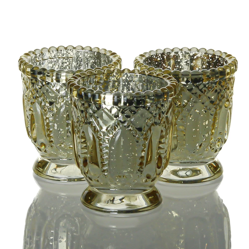 This royally-inspired glass holder has a intricate, detailed design and glimmering light gold mercury finish that makes this piece a must-have for home or event! The glass beading detail on the rim of the petite-sized holder leads into a lovely tapered-shape textured body and elegant base. Once filled with a candle, the glow through the shining dappled finish is breathtaking! Metallic Gold outside, Silver on the inside. A perfect choice for weddings, dinner parties, restaurants, and upscale décor!