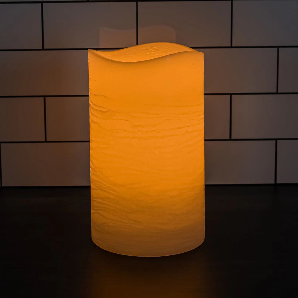 Make a BIG statement with this amazing oversized LED Pillar Candle! This hassle-free candle option features a real wax outer shell with wave texture, charming wavy top, and flickering amber-colored LED flame. Great for home, event, weddings, no-flame venues, and more! Use this substantially sized battery-operated candle on its own for a simple yet impressive display; or pair with our 6″x8″ and 6″x12″ sizes (sold separately) to create the perfect graduated looks in any space.