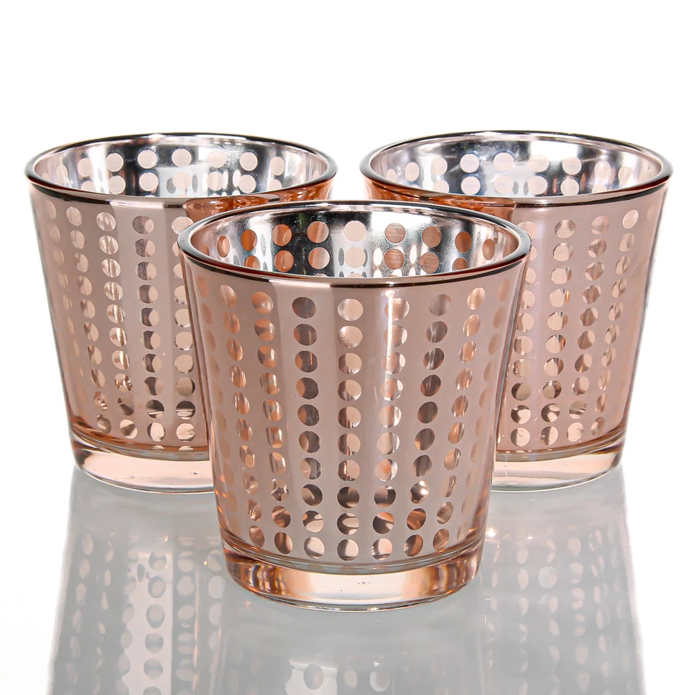 Metallics are in! Our fabulous line of silver, gold, and rose gold metallic glass holders will make your home or event a little more magical. This medium size holder features quality glass, a rose gold metallic dotted design, and tapered shape. Add our Richland Votive or Tealight Candle options to complete your look (candles not included). The candlelight shining through the dots of the design creates an amazing ambiance on tables and surfaces. Not dishwasher or detergent soap safe.