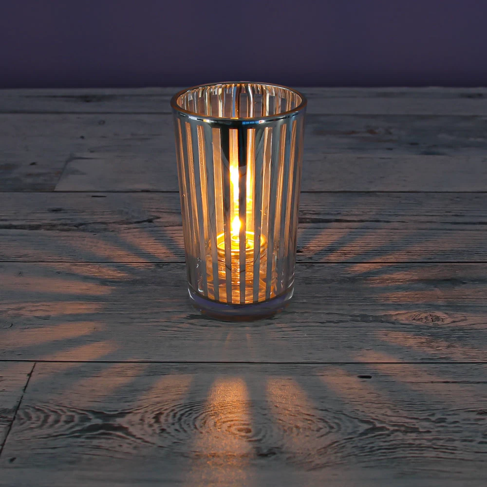 Metallics are in! Our fabulous line of silver and gold metallic glass holders will make your home or event a little more magical. This tall and narrow holder features quality glass, a silver metallic stripe design, and elegant tapered shape. Add our Richland Votive or Tealight Candle options to complete your look (candles not included). Candlelight illuminates the holder, creating rays of ambiance through the design on tables and surfaces.