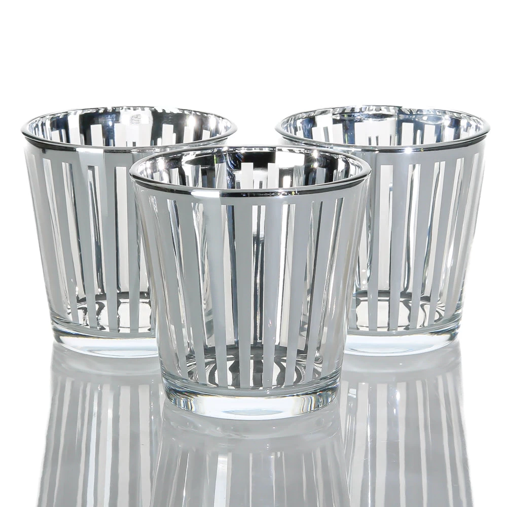 Metallics are in! Our fabulous line of silver, gold, and rose gold metallic glass holders will make your home or event a little more magical. This medium size holder features quality glass, a silver metallic stripe design, and tapered shape. Add our Richland Votive or Tealight Candle options to complete your look (candles not included). Candlelight dancing through the lines of the design creates rays of ambiance on tables and surfaces. Not dishwasher or detergent soap safe.