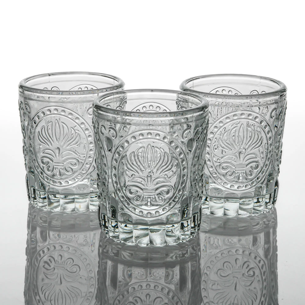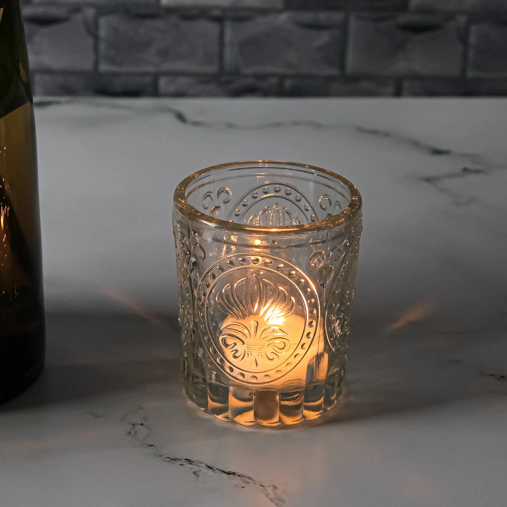 Terrific Texture! This detailed holder is a beautiful space for your candles to find a home and glow the day and night away. This thick glass of this piece features an intricate raised texture design to create a vintage look and feel. This detailing makes this one of our favorite glass candle holders! This piece incorporates well into centerpieces; but it also serves well on its own for a stunning accent. Perfect for weddings, events, and home decor!