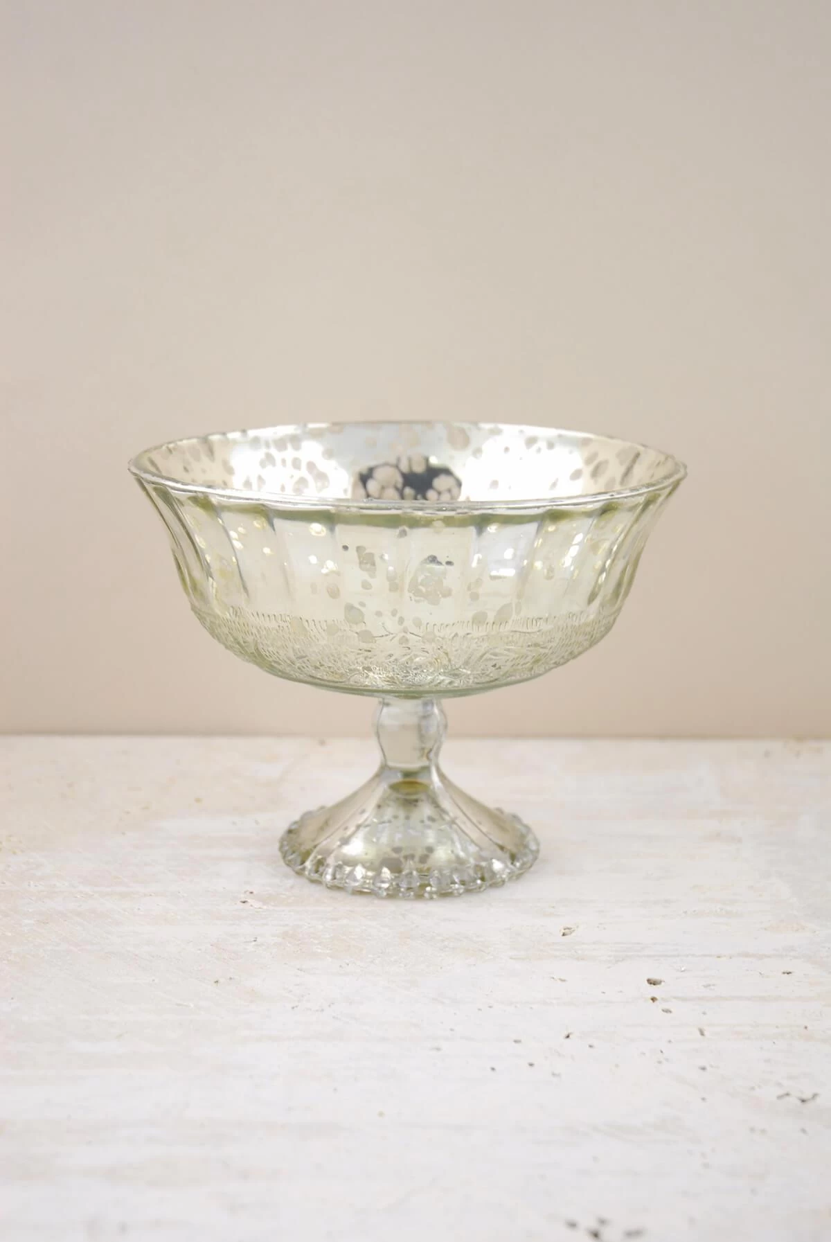 Highlight your sense of style with this Silver Mercury Glass Compote! This stunning metallic bowl is perfect for adding a little sparkle to any evening event or upscale home décor. It features a slightly scalloped edging, elegant shape and pedestal, and charming beads of glass on the base. Use this piece to showcase colorful blooms at your wedding or special event, or place it inside a curio cabinet for a fashionable display in any setting.