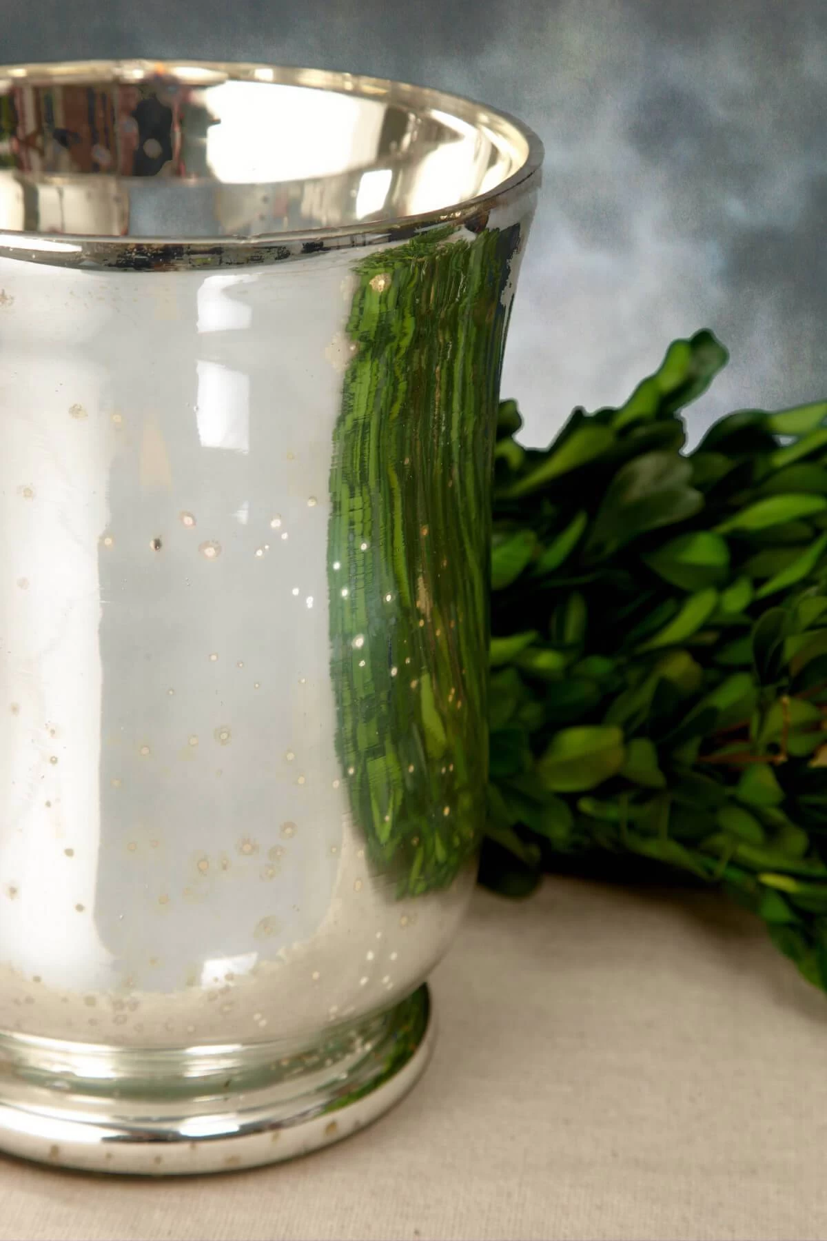 Decorate your home or special event with this stunning Mercury Glass Hurricane Vase. The classic shape and sleek, silver finish of this piece make it perfectly suited to adding sparkle and shine to any glamorous setting. Place a large pillar candle inside this 6″ vase and admire the warm glow it emits. Display this candle holder along with other mercury glass accents on your mantel or on reception tables for a captivating presentation.