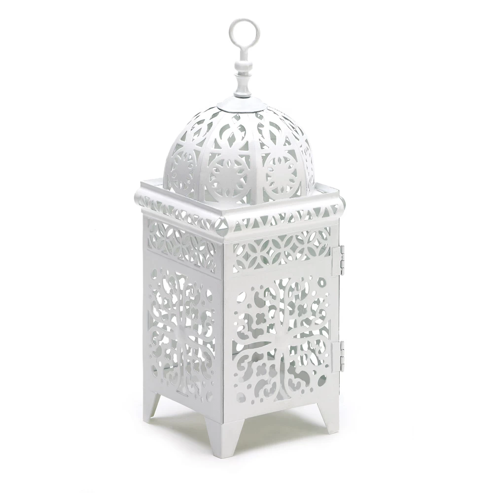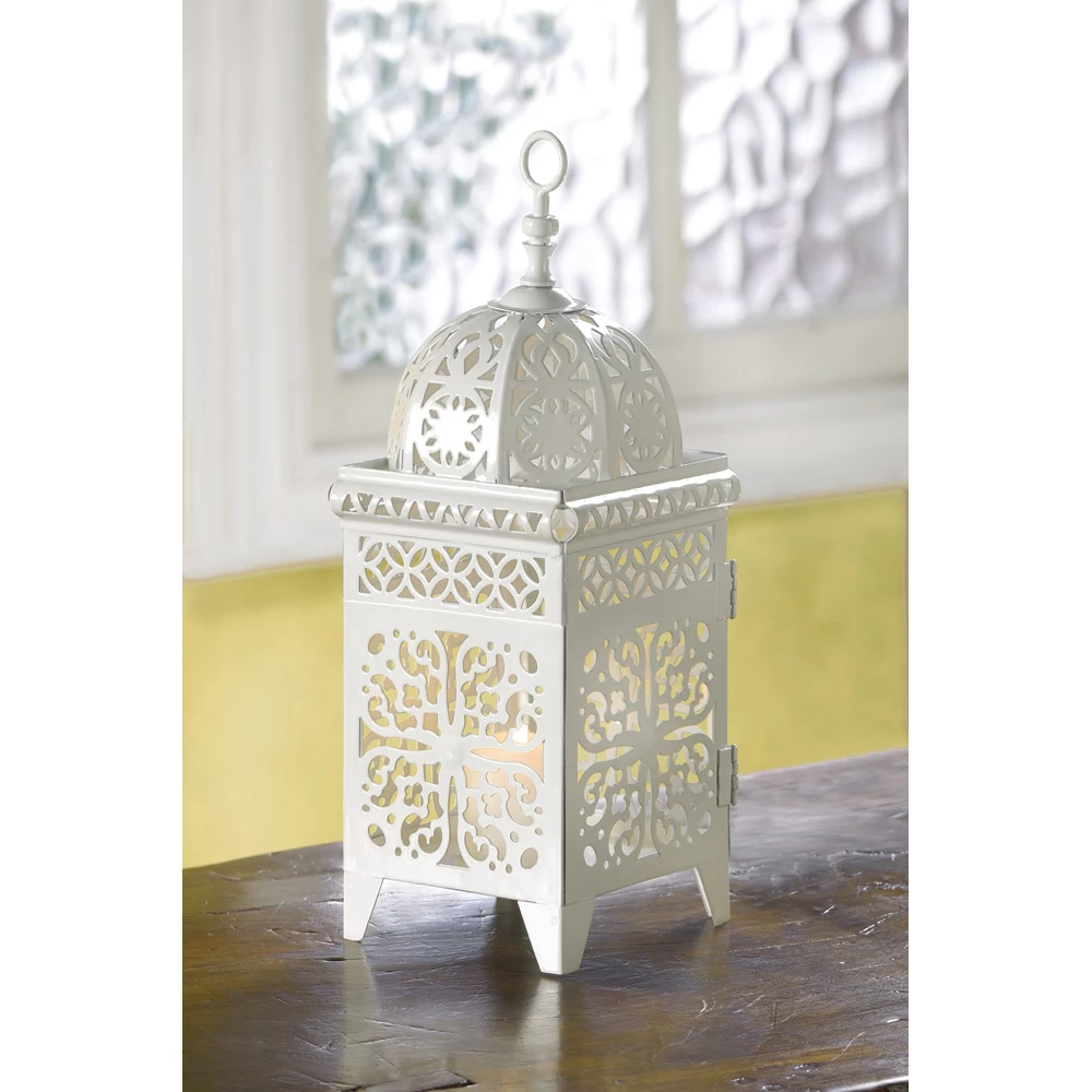Intricate floral filigree in white adds fresh appeal to this birdcage lantern! Jubilant points of light from within bring any space to life!