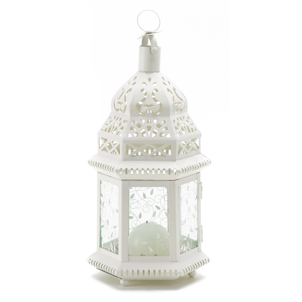 Candlelight shines from the cutout design of this lovely lantern. Hexagonal hurricane shape and etched panels combine for a truly stunning effect!