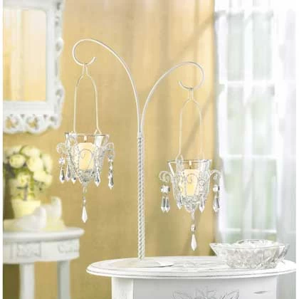 Uniquely beautiful tabletop stand boasts two hanging votive chandeliers. Glittering crystals and curving lines delight the eye!
