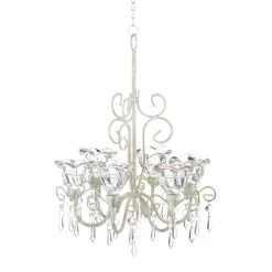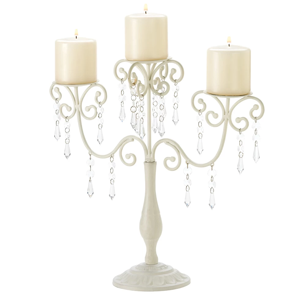 Dripping with glittering crystals, graceful ivory curlicues create a showy support for a trio of candles. Delightfully extravagant with a touch of Old-World elegance!