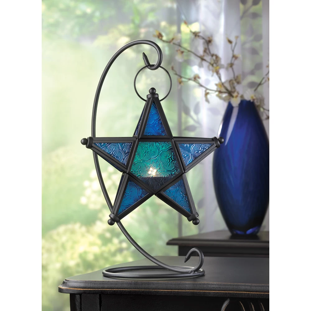 Make a wish on this beautiful blue star! Simply add a candle to this lovely accent lantern to fill the area with an enchanting azure light. Beautifully fashioned from matte black metal and pressed glass for an artistic presentation.