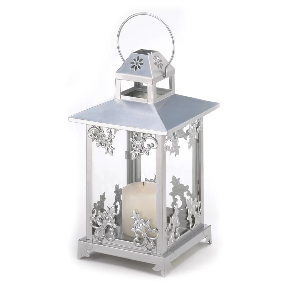 Gleaming silver finish and graceful scrollwork lend old-fashioned opulence to a classic candle lantern. An elegant decoration to enjoy, night and day!