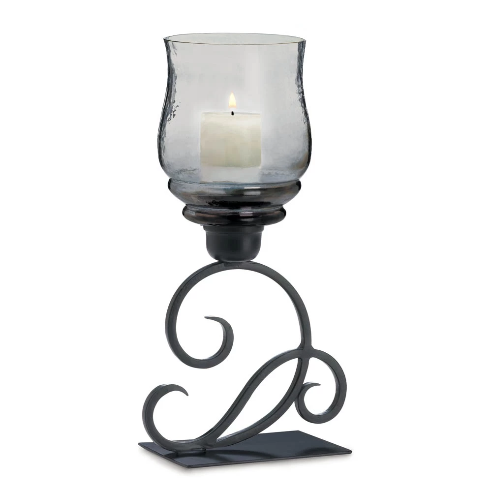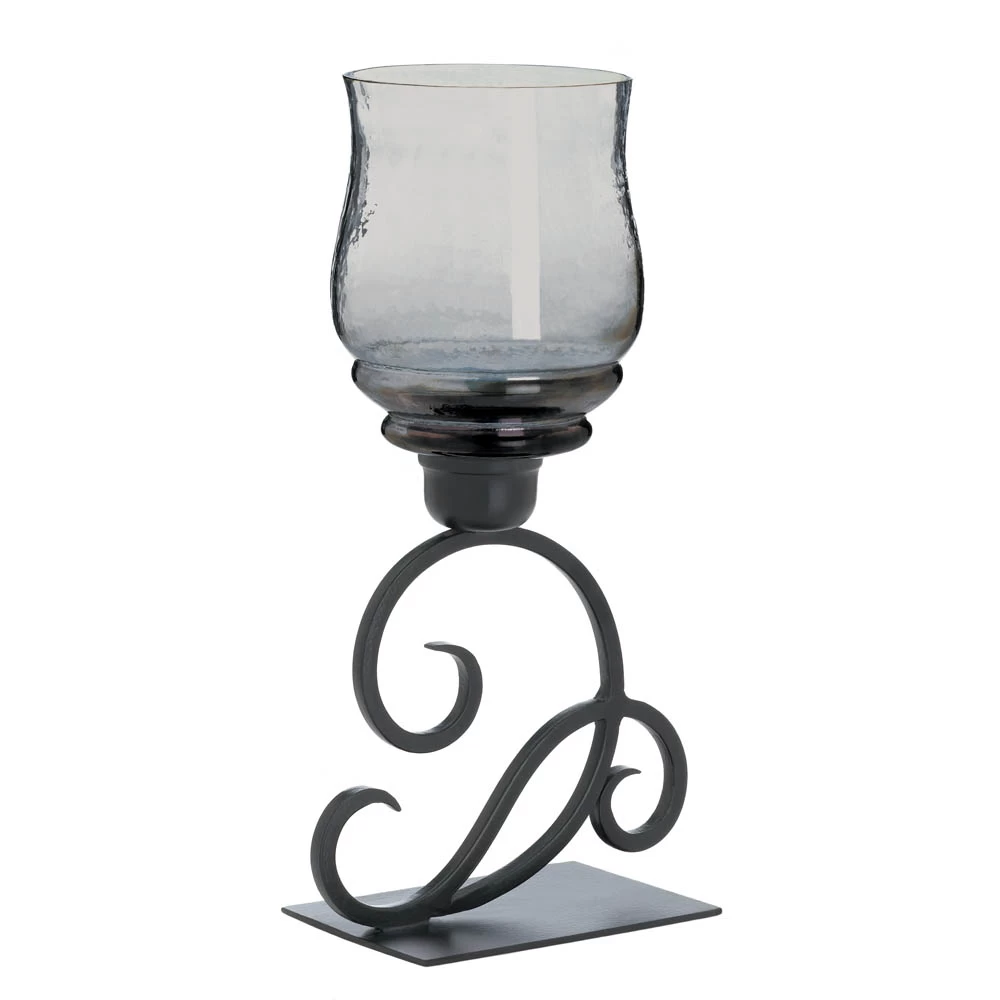 A flourish of style makes this candleholder a real standout. The black iron base features a scrolling flourish design on a flat rectangular base. Above is a smoked glass candle cup that will shimmer when you light a candle inside.