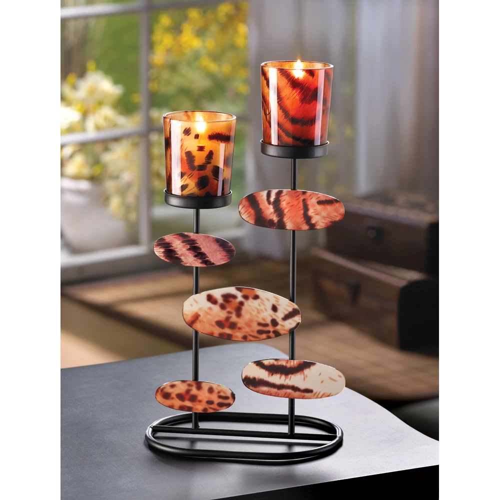 Be gone, boring candle stands; this mod-art marvel is the life of any party! A lively tiger print sparks up conversation, lending its lovely looks to a duo of candle cups and quirky cutout mirrored shapes.