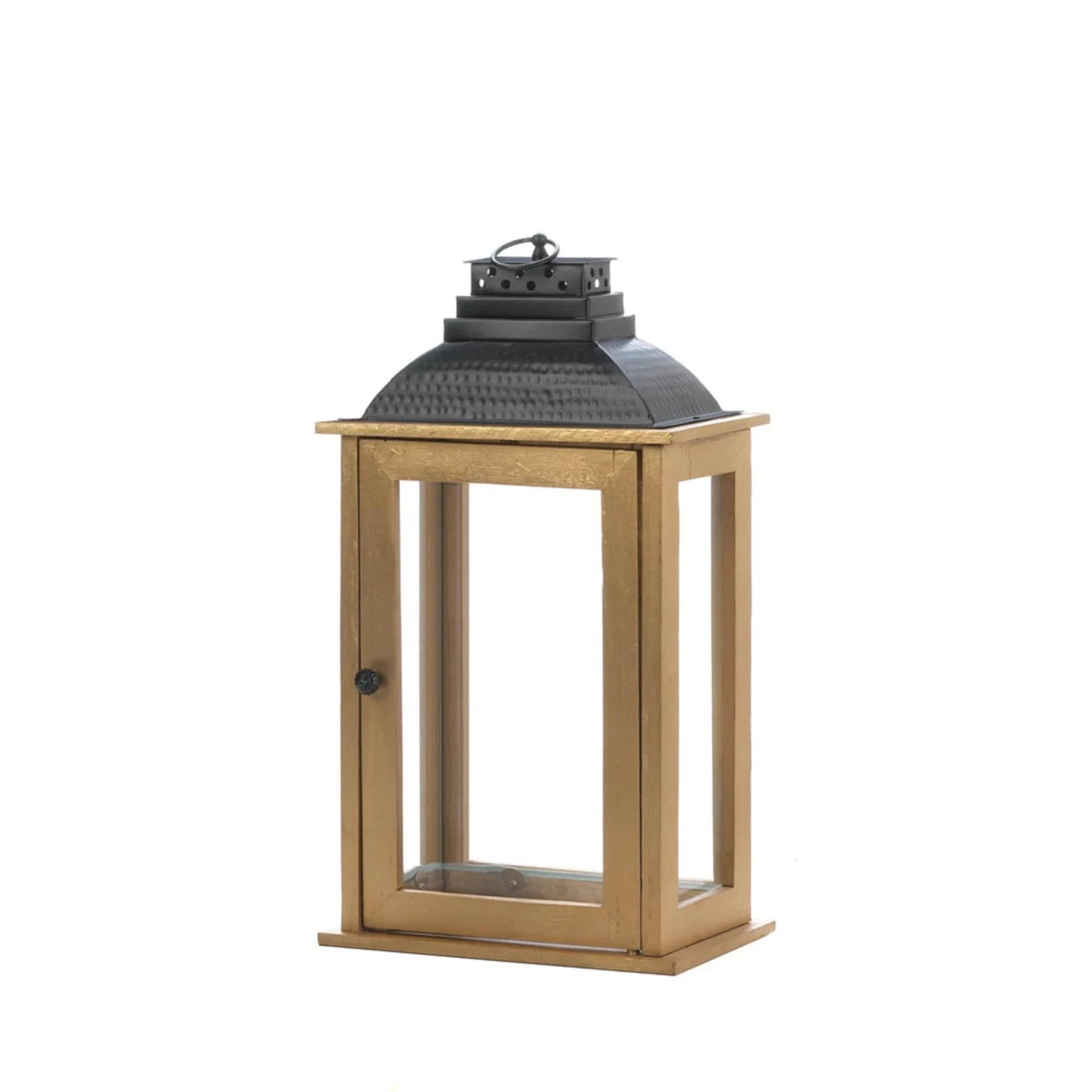 With its warm golden wood tone finish and hammered iron top, our medium Tuscan Lantern will make your home feel like an Italian villa. Pair our medium and large Tuscan lanterns together to create a dreamy table setting. Mango wood frame. Hammered iron top. Glass window panes.